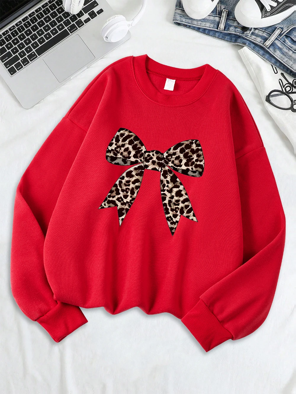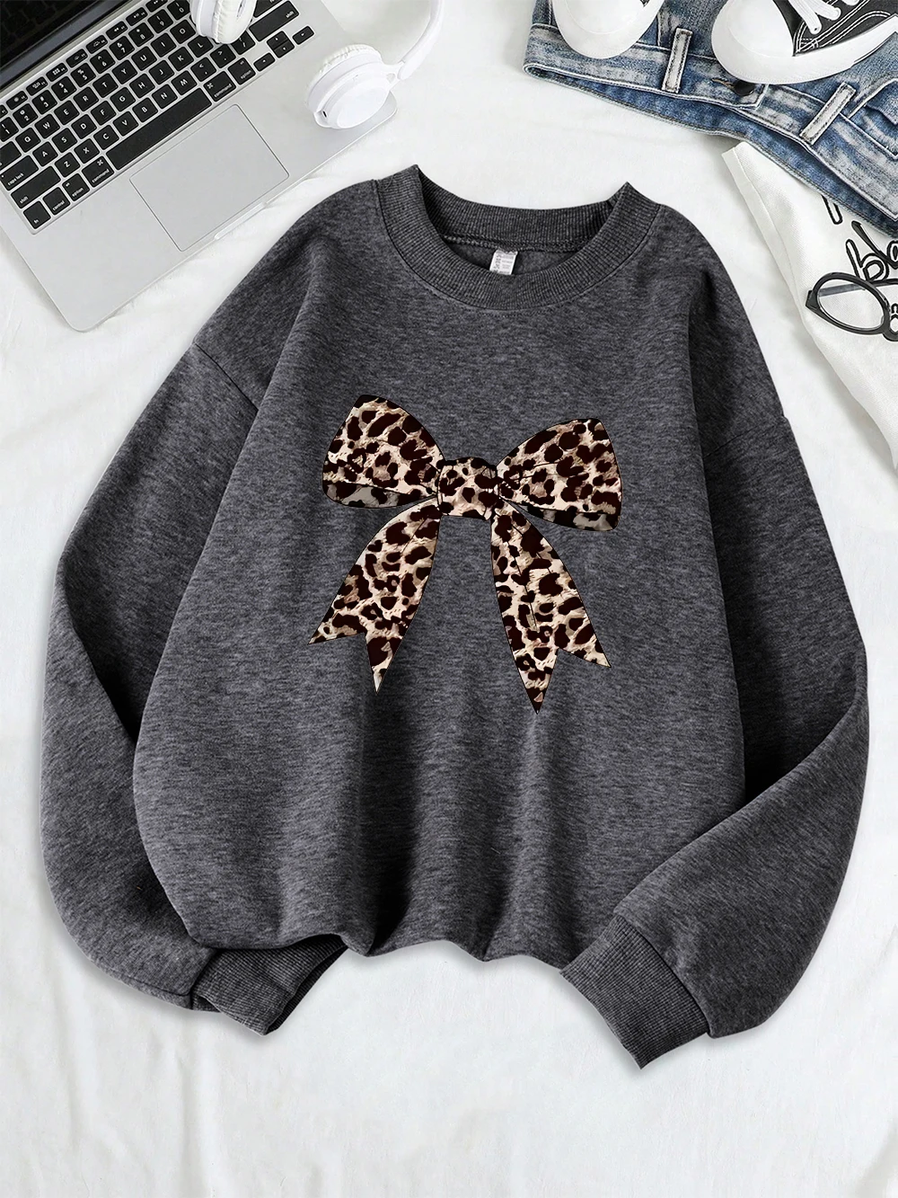 Bow Leopard Printing Sweatshirts Womens Crewneck Basics Hoodies Loose Fleece Warm Clothes Autumn Winter Sporty Woman Pullover