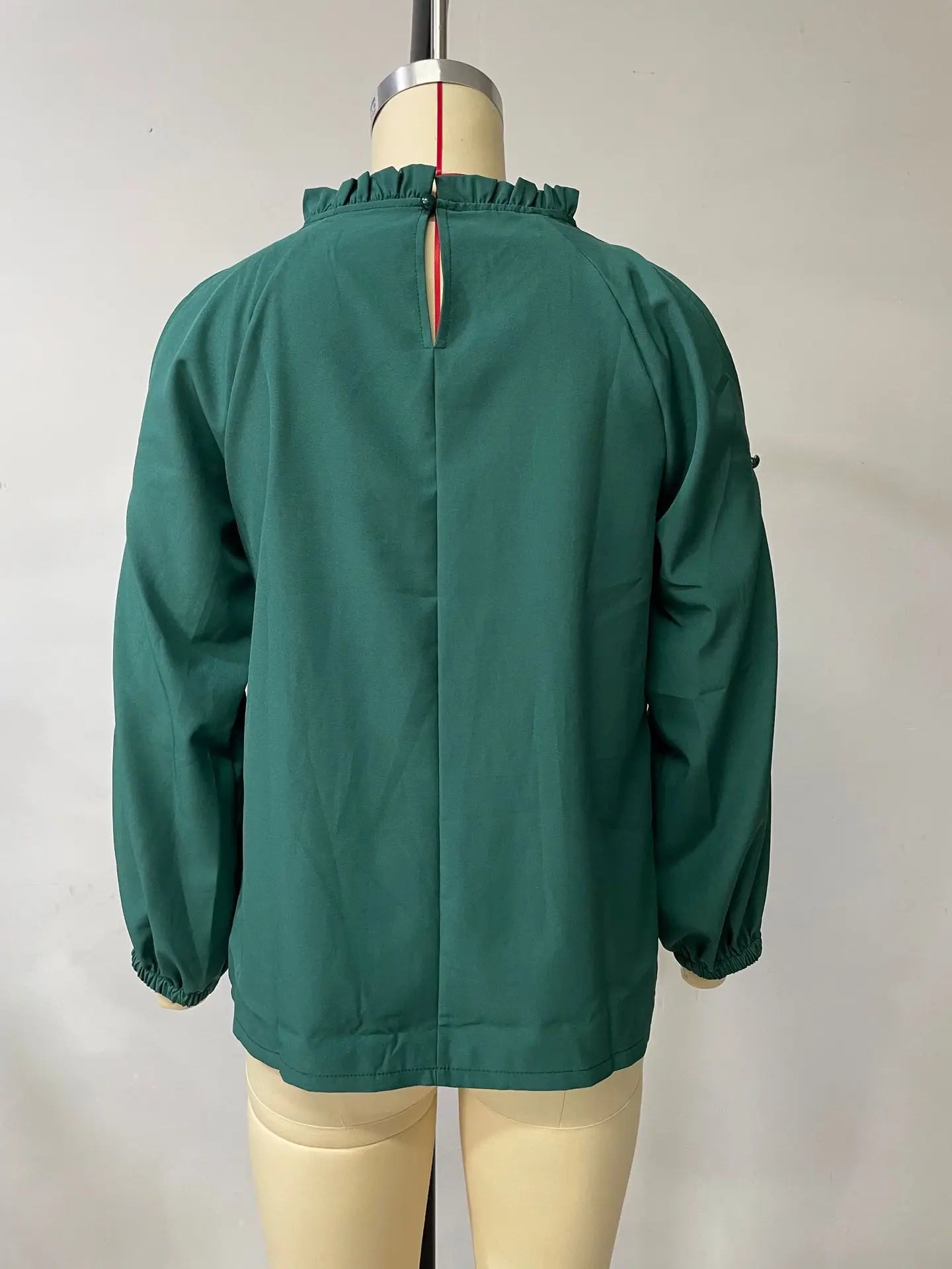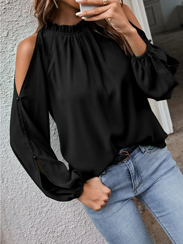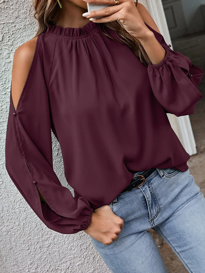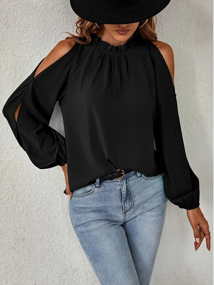 Fashion lotus leaf pleat semi high neck off shoulder hollowed out long sleeved top spring autumn women's elegant temperament top