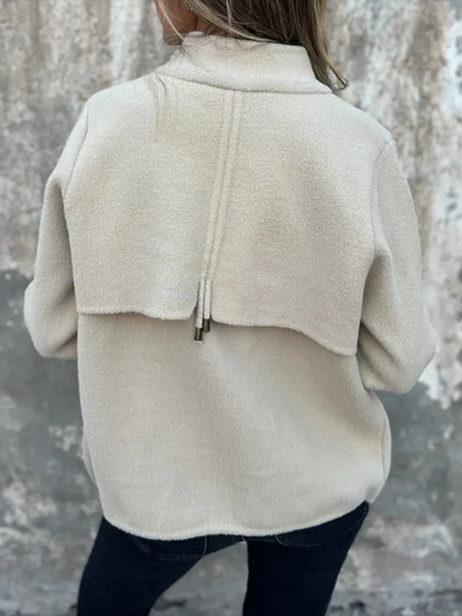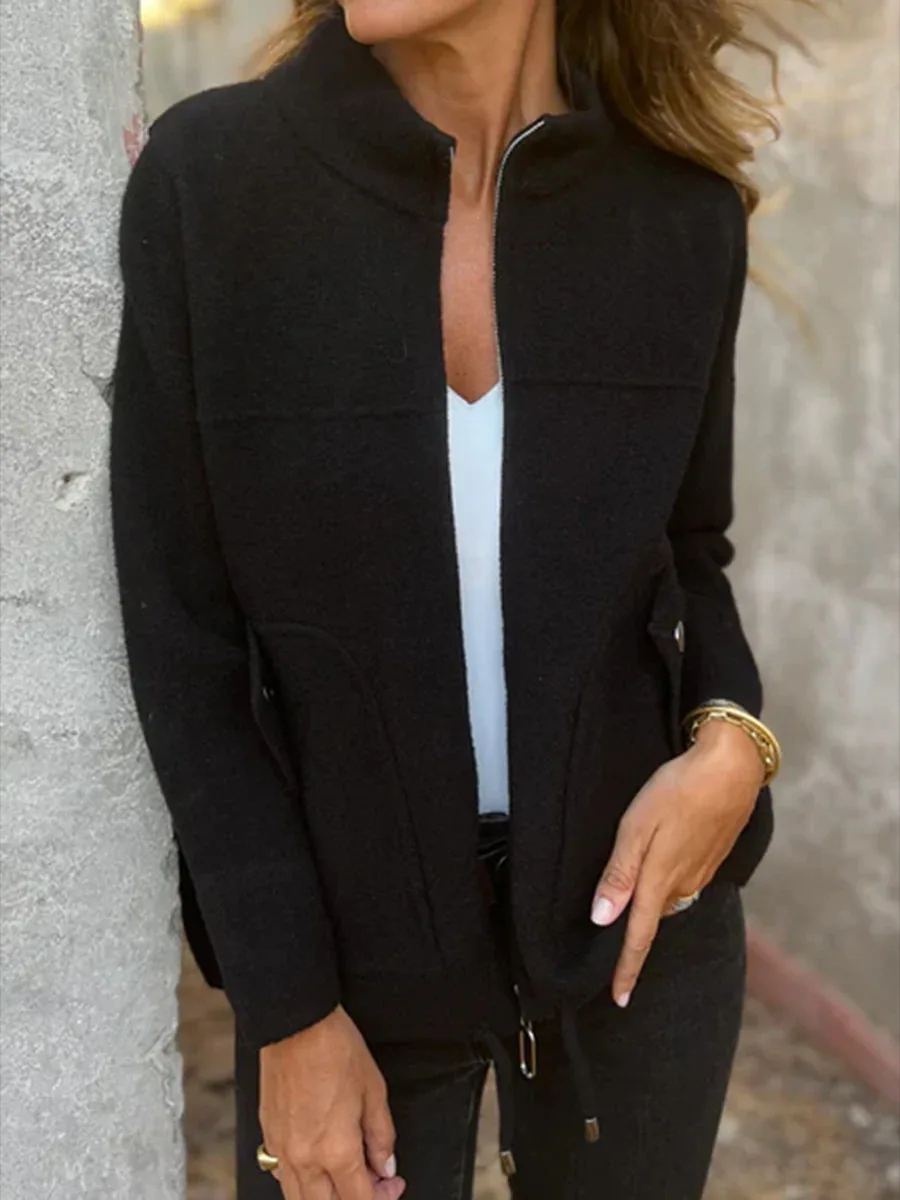 New Casual Zipper Cardigan Wool Jacket For Women's 2025 New Fashion Stand Collar Tether Pocket Loose Versatile Female Wool Coat
