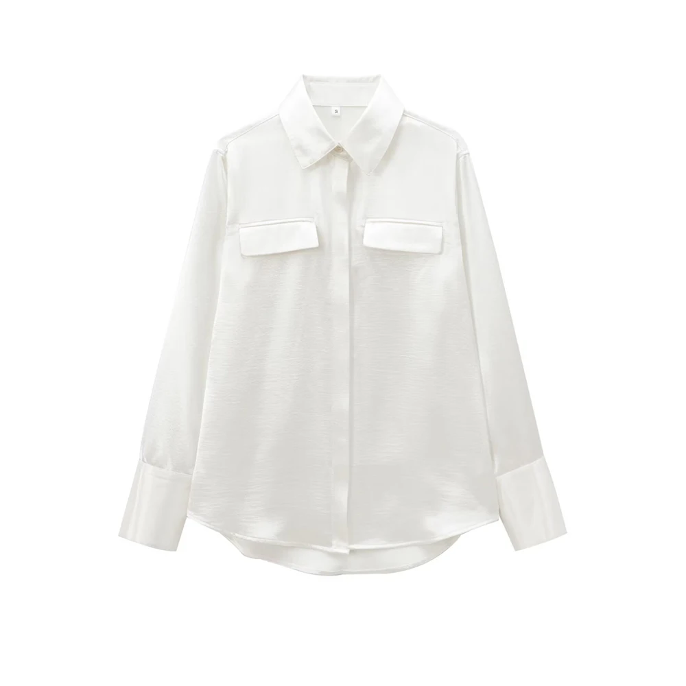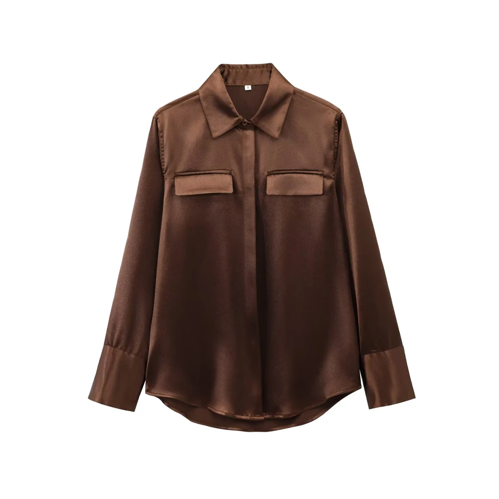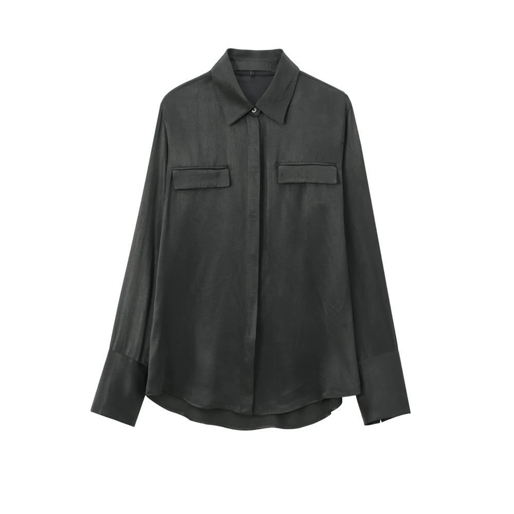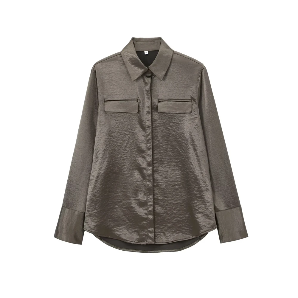 TRZA-Satin Shirts with Pockets for Women, Long Sleeve, Button-up, Female Blouses, Chic Tops, Fashion