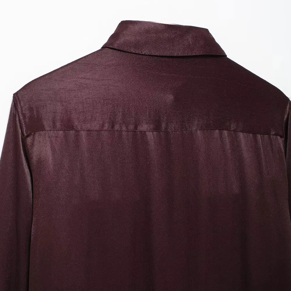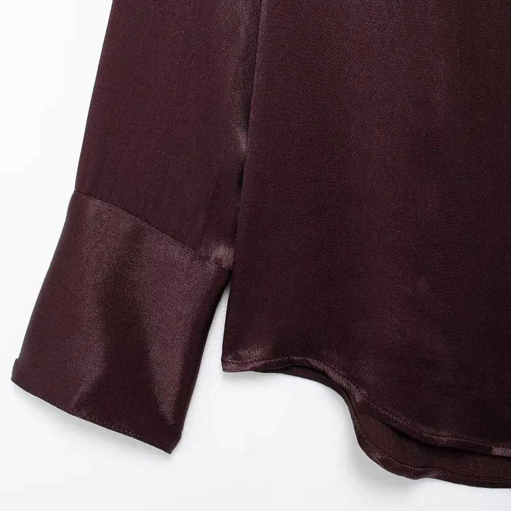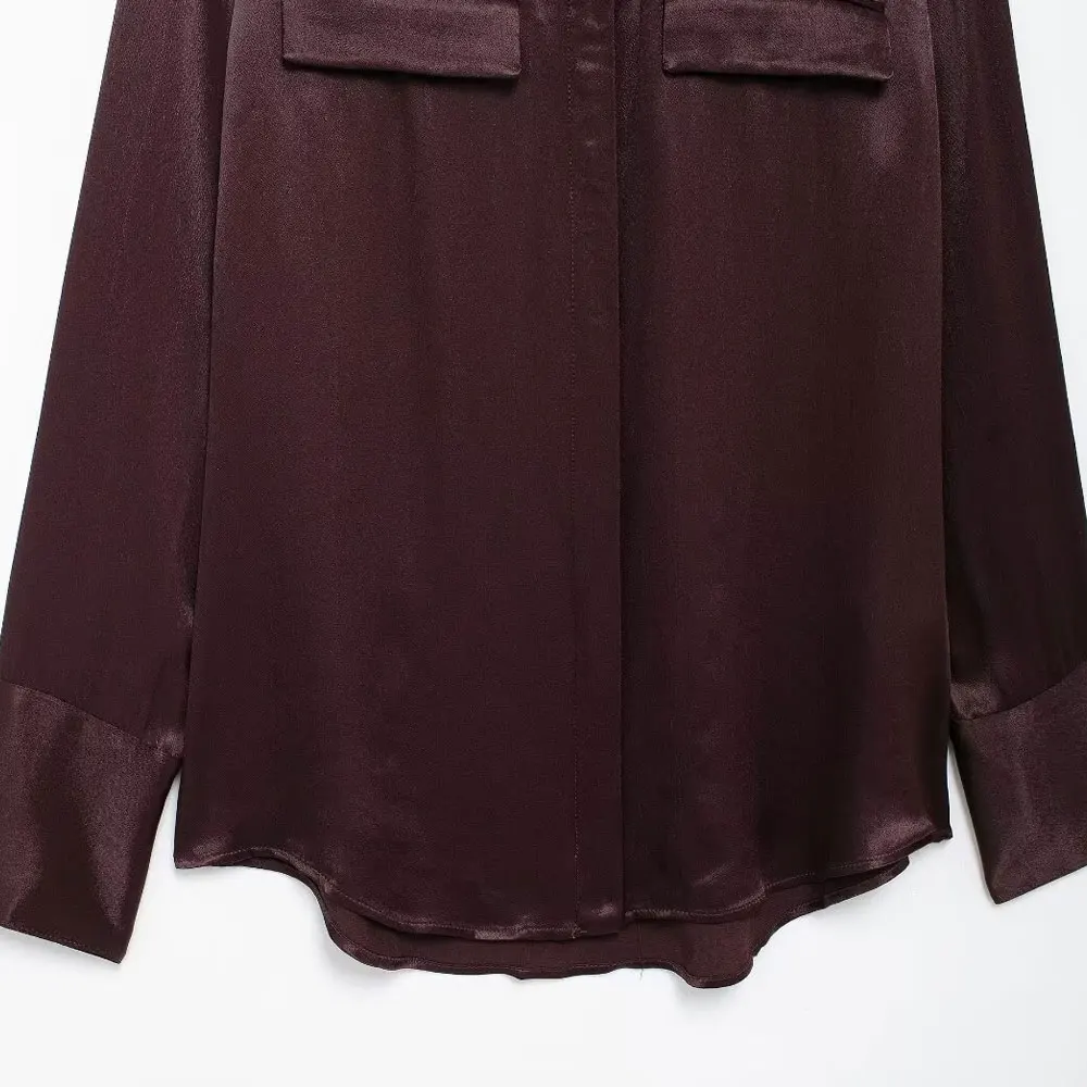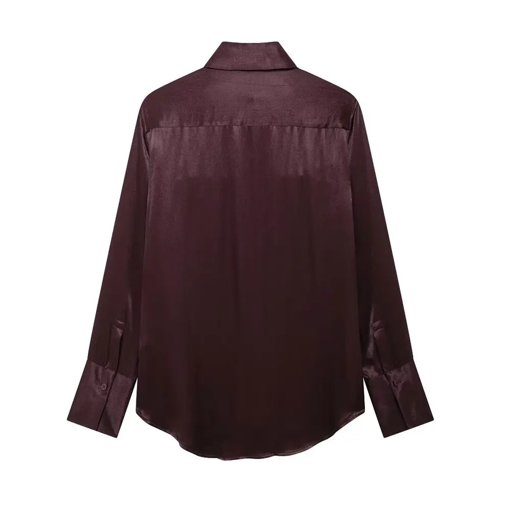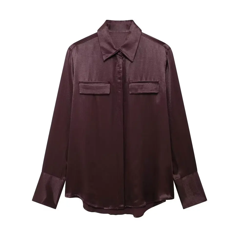 TRZA-Satin Shirts with Pockets for Women, Long Sleeve, Button-up, Female Blouses, Chic Tops, Fashion