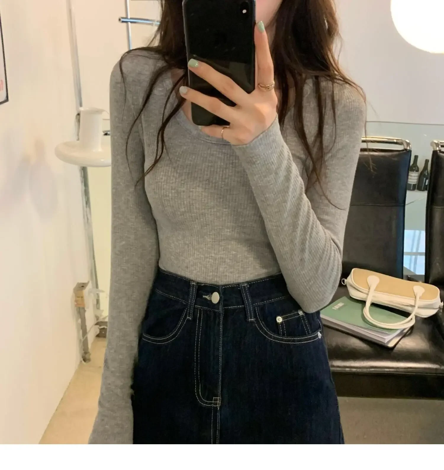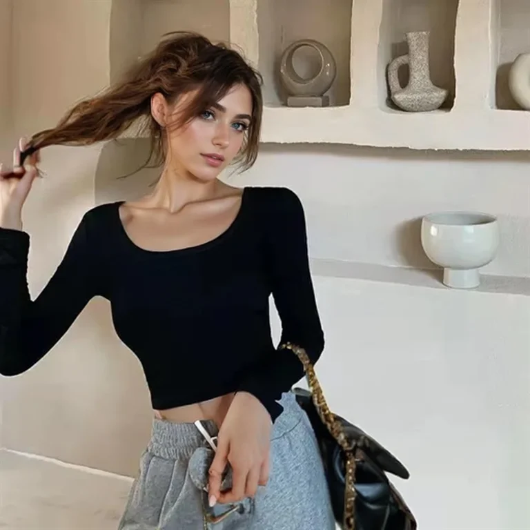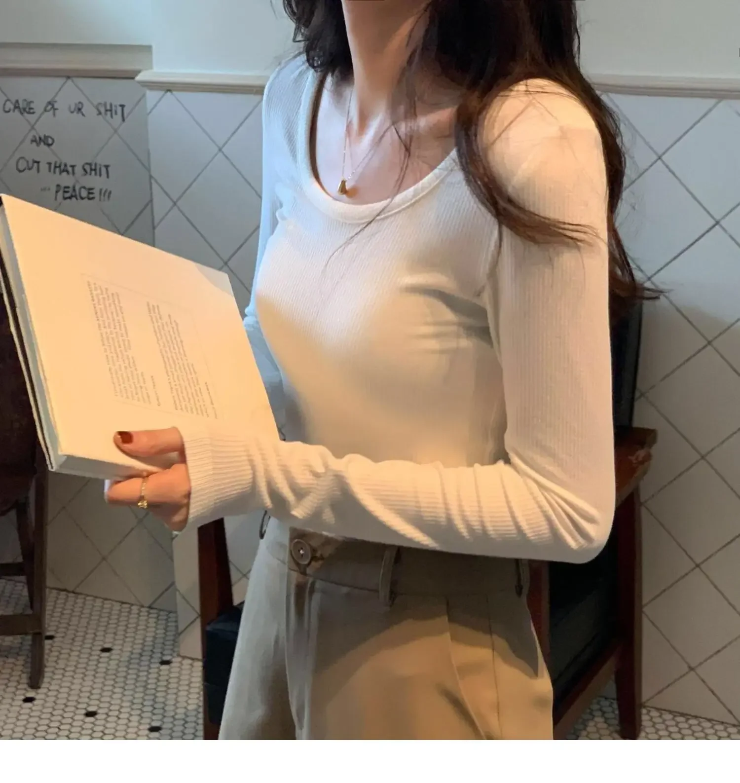 Women Slim Fit Long Sleeve White T-shirt Innerwear Base Shirt Autumn Season Trendy Threaded Round Neck Top